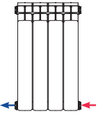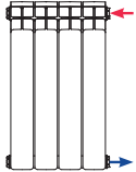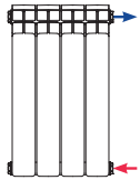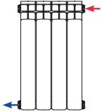 - Оснастить радиатор предусмотренной проектом терморегулирующей и запорной арматурой согласно схеме его подключения к системе отопления (рис. 3). Арматура закручивается в резьбовые отверстия пробок, предварительно установленных в коллекторы радиатора. Непосредственно перед монтажом пробок их про-кладки следует смазать термостойким (до 110 °С) силиконовым герметиком. Момент затяжки пробок в коллекторах радиатора не должен превышать 65 Нм. Радиатор должен быть снабжен клапаном для удаления воздуха.